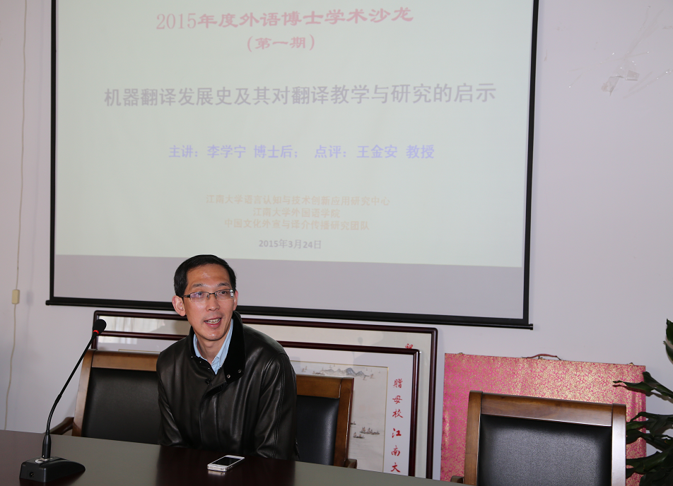 随后,李学宁博士做了“机器翻译发展史及其对翻译教学与研究的启示”的主题讲座。李博士从索绪尔《普通语言学教程》的历史意义与数学之于语言研究的重要性谈起,借鉴语言学、数学、计算机科学甚至哲学的思想与成果来系统寻踪并客观分析了机器翻译的发展阶段、主要人物、重要概念、本质属性、翻译标准、课程开设、市场开发以及对翻译教学与研究的启示。李博士的讲解深入浅出、旁征博引、讲解风趣、举例生动,受到了参与者的一致好评。在老师们和李博士进行了简短的互动后,王金安教授以其开阔的学术视野、深厚的理论功底与精辟的语言文字对李博士的讲解与该场学术沙龙进行了精彩点评。沙龙最后在老师们的自由交流中落幕。