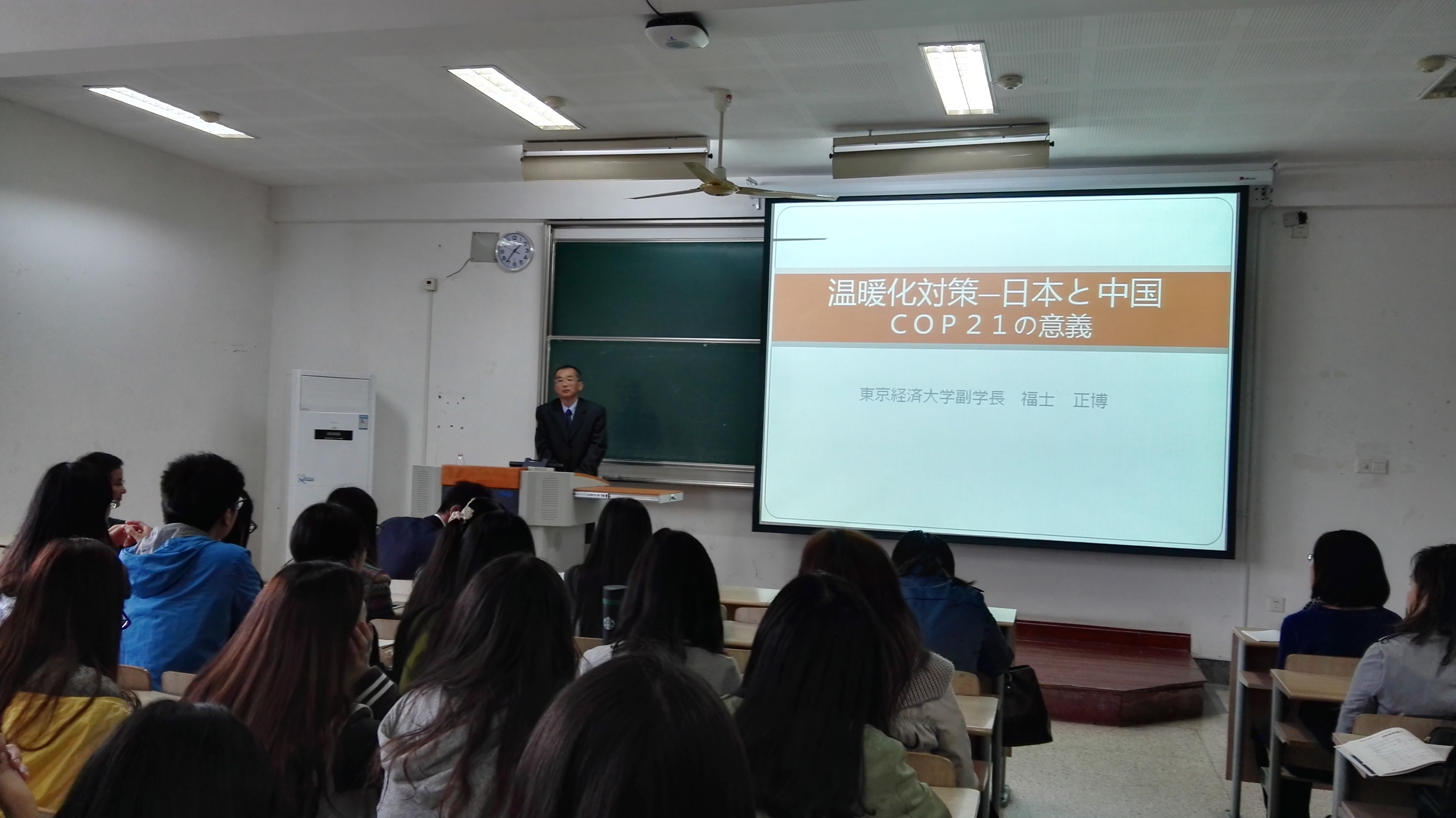 2015年11月4日,在我校二教举办“关于全球气温变暖及其应对措施”的讲座。这次讲座邀请了东京经济大学福士正博教授及校方代表,由色情网站