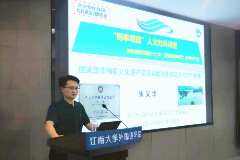吴歌作为吴语地区民歌民谣的总称,是江南劳动人民创造的珍贵文化遗产,2006年被列入第一批国家级非物质文化遗产名录。朱义华老师首先从历史溯源切入,梳理了吴歌的演变脉络及形式,并从吴歌保护传承的现状、不足与吴歌译介传播的内涵三部分入手,系统阐述了吴歌译介传播的必要性与可能路径。接着,他针对吴歌译介的可行性、价值与意义进行了详细阐述,指出符际翻译观与文化种子移植观有利于解决吴歌在翻译中遇到的方言障碍与可表演性维度上的难题。他认为采用多模态、富媒体、数智化的外宣译介与传播手段,有利于促进了吴歌的国际化保护与传承,有利于推动多元系统的演化与文化多样性的维护,同时对提升我国文化软实力与其他非物质文化遗产的保护传承也积极的意义。最后,朱老师还解答了听众的提问并积极参与提问与提供志愿服务的师生赠送了书籍《吴歌精华》,为本次活动画上了圆满的句号。