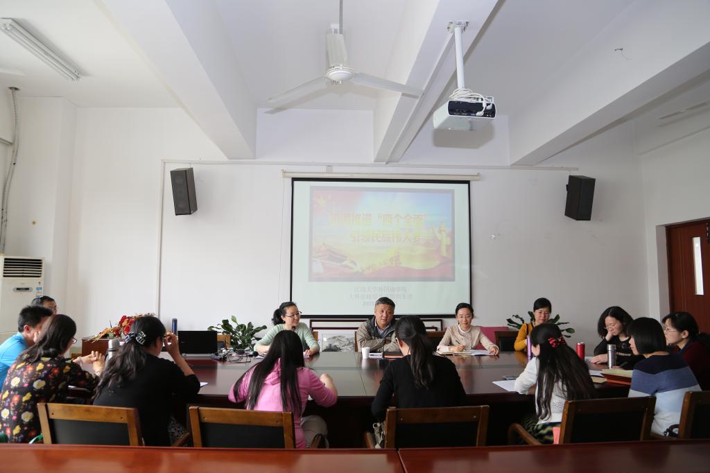 接着,支部四位党员分别就“四个全面”交流了学习的心得体会,更深入详细地介绍了每一个“全面”的具体内容和时代内涵,并结合实际提出了一些值得思考的问题:宣泠老师就深化改革话题紧密联系正在全校推进的大学英语改革,分析了改革的成绩和困难,提出作为党员老师,在工作中应坚持改革创新,为学生搭建优质的学习平台;周迓菁老师就从严治党落实到高校这一话题阐述了自己的看法,提出了从理论学习、责任追究、从严监督等三方面在高校实现思想建党,制度治党;撒忠清老师从教师职业角度出发,围绕立德树人,创新驱动,教育公平与发展等方面阐述作为高校教师该如何服务于“四个全面”;刘丹丹老师则着眼宏观,分析了“四个全面”的内在逻辑性,提出在以理工科见长的
