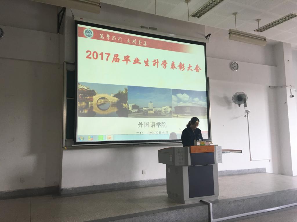 2017届学生升学表彰大会暨升学经验分享会在2A127教室召开。院党委黄城芳书记、英语系李学宁主任、日语系崔明姬主任、辅导员刘琦老师等应邀出席会议。会议由钱薇薇老师主持。