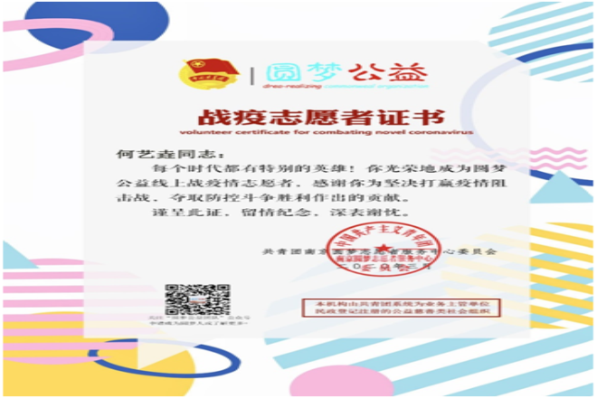 本次评选活动共评出11名居家战“疫”最美志愿者。这些学生志愿者中有的在小区担任疫情防控宣传工作,有的协助社区工作者进行疫情排查,有的参与无锡市防疫书籍翻译项目···他们在自己的岗位认真工作,默默贡献自己的一份力量。参与社区疫情防控的英语1904孟晓钰说:在志愿工作过程中,切身感受到了国家以人民为中心的发展思想以及对于疫情防控工作的重视和投入。虽然不能奔赴前线,但通过志愿岗位也为国家战胜疫情做出了贡献。