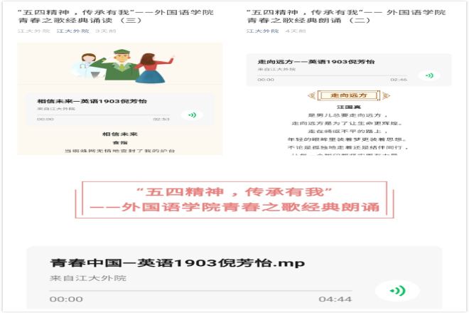 五四风雷,激荡百年;五四精神,薪火相传。五四期间,色情网站 利用学院微信公众号推出三期青春之歌经典朗诵分享。第一期推出《青春中国》,第二期推出《走向远方》、《山高路远》,第三期推出《相信未来》、《热爱生命》。通过诵读经典,引导学生从经典中汲取精神力量,进一步加深对五四精神内涵的理解。
