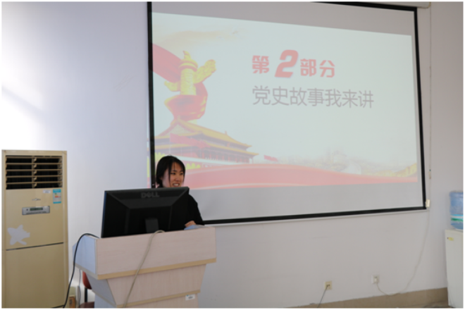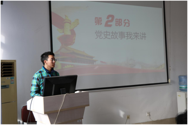 不懂历史的民族没有根,淡忘英雄的民族没有魂。在这百舸争流、千帆竞发的新时代,讲好一个故事胜过一打道理,只有人人都会讲党的故事,人人参与讲好党的故事,红色基因传承才能永葆活力。英语1803雷锋特称团支部同学上台分享了他们熟悉的党史小故事。潘诗婷同学讲述了王树声同志三次搬家的故事,向我们展现了中国共产党党员的廉洁精神;秦玉洁同学则为我们阐述了中共一大召开的历史,让我们对中国共产党的成立过程更加清晰;史雪茹同学和王佳宁同学也分别为我们讲述了陈毅同志和聂荣臻同志的故事,让我们认识到党全心全意为人民服务、时时刻刻关爱人民的品质。