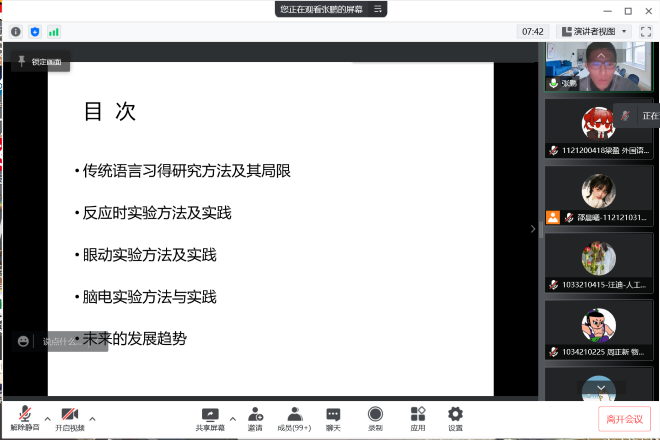 本次圆桌交流会张鹏老师的分享共分三部分。首先是对传统语言习得研究方法及其局限性的介绍。张老师以传统的问卷调查为例,为我们具体分析了实验语言学的传统研究方法中存在的几个问题,引领同学们直观地了解静态实验数据无法明确语言加工的“过程”、无法区别语言的“理解”和“产出”等局限性。其次是结合实例讲解了当前语言学前沿的主要研究方法。在这一部分,张老师详细地介绍了三种实验方法,分别是反应时实验方法、眼动实验方法和脑电实验方法。接着又通过几个相关研究实践的讲解来加深同学们对这些实践方法的理解。张老师专业认真的讲授让同学们对实验语言学的研究方法、基本原理及设计程序有了一定的了解,开拓了学术眼界,受益匪浅。最后,张老师与同学们一起分析了实验语言学未来的发展趋势,并发出了“科研时疫,共克时艰”的号召。