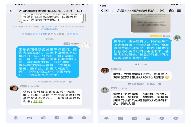 4月5日晚,在明确工作要求的基础上,学院迅速成立了2020级、2021级共12个防疫关爱护卫队,由93名防疫守护者组成,通过微信群、QQ群、腾讯文档等平台建立联系,明确日报流程。