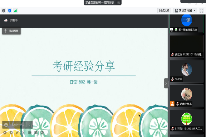 在5月6号进行的国内考研分享中,考研到外交学院的杨静怡同学主要针对MTI(翻译硕士),从时间分配和规划、专业课学习以及复试三个大方面,详细地介绍了自己的考研过程和感想;考研至中国海洋大学的谢淑敏先讲述了自己备考政治、日语、基础英语、综合英语四门考核课程的过程,建议专业课一定要尽早准备,打下基础;考研至上海财经大学日语MTI的钟小凤同学分别从日语MTI和百科知识与写作展开,分享了复习阶段的经验;韩一诺同学考研至北京外国语大学日语语言文学专业,她从选择、规划、心态三个方面入手,最后和同学们分享了调整心态的小建议,即如何输出坏情绪、保持好心情,有益地缓解同学们的考研焦虑问题。