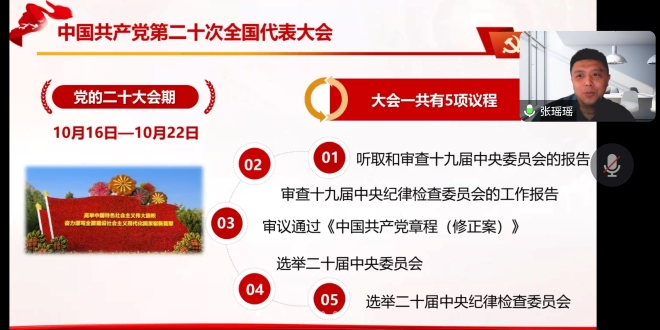 首先由张瑶瑶老师讲述党的二十大报告内容和重要精神,引导青年学生深刻理解二十大精神,争做时代好青年。张老师从关键词出发,用清晰明了的讲解和贴近日常生活的事例来引导学员深思细悟,理解党的百年奋斗目标和报告的前三大部分内容。张老师叮嘱青年学生要牢记习近平总书记的嘱托,坚定党的引导,在“坚定理想信念”、“学好本领,勇于担当”、“艰苦奋斗,勇攀高峰”三个方面继续提升自我,踔厉奋发,牢记党和国家,牢记青年使命。