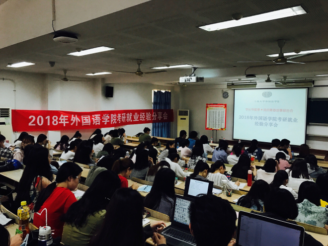考研就业经验分享会于5月23日晚在2D308举行。院分团委书记杨艳、辅导员张圆、黄颖出席本次活动,10位优秀应届毕业生作为分享嘉宾来到现场,15级全体学生及16级、17级部分学生参加了分享会,会场座无虚席。