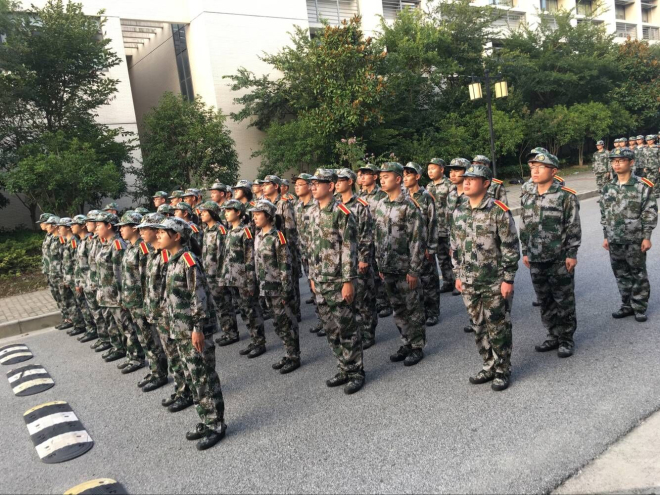 全体参训同学在教官的激情指挥下合唱了《团结就是力量》、《爱警习武歌》等军歌,嘹亮的歌声展现了同学们昂扬的斗志和朝气蓬勃的精神面貌。接下来,黄书记代表学院对全体承训教官表示衷心的感谢,向全体参训学生表达关怀和殷切希望。对外院学子坚毅与拼搏的精神给予了高度肯定,并鼓励同学们培养吃苦耐劳、坚持到底的优秀品格。随后,学院领导和老师为同学们分发了面包、饮料等慰问品。“千里送鹅毛,礼轻情意重。”虽然只是简单的食品,但让大家感受到了学院对每一位同学深深的关心和爱护。同学们再次唱响军歌表达了对冒雨慰问的学院领导老师们的感谢。最后,慰问活动在学院领导、老师与教官、同学们的合影留念中圆满结束。