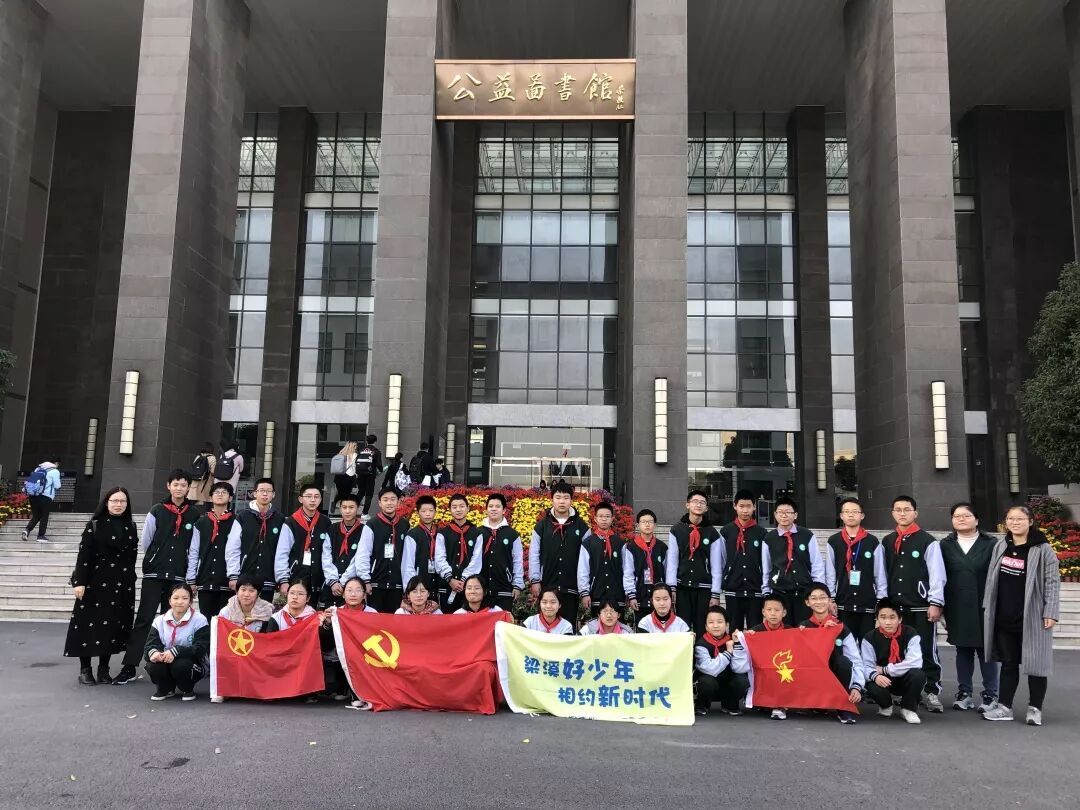金星中学学生在图书馆前合影留念