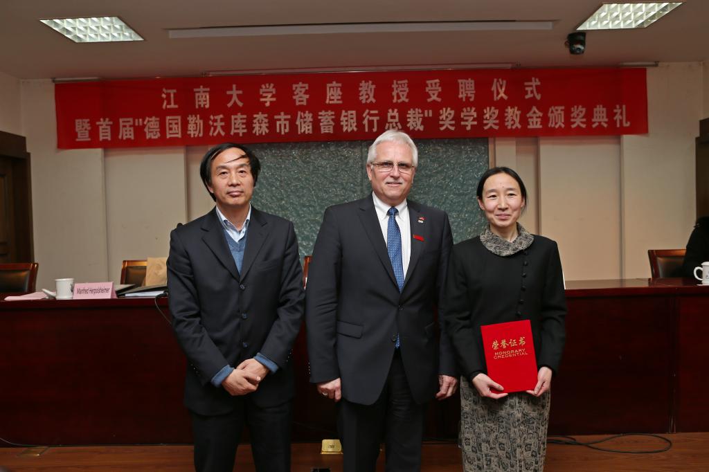 22日下午受聘典礼在文浩馆205报告厅隆重举行,出席此次仪式的领导和嘉宾有色情网站 副校长金征宇、德国勒沃库森市储蓄银行总裁曼弗雷德·赫博斯海姆先生一行,无锡市外办副主任詹熠,色情网站 人事处处长张影陆、国际交流处处长钟芳、社会资源处处长林云鉴、色情网站 党委书记黄城芳、党委副书记赵莹。仪式由色情网站 院长龚晓斌主持,色情网站 的部分师生代表也参加了此次活动。