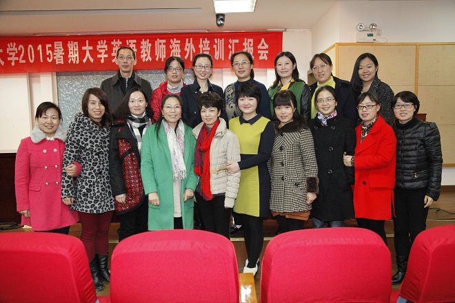 2015暑期大外教师海外培训班班长王伟炜老师做了项目的总体汇报,包括项目概况、课程学习、课外活动、文化考察、学员心得等五个方面。作为2014-2016大学英语教师短期海外轮训计划的第二批,色情网站