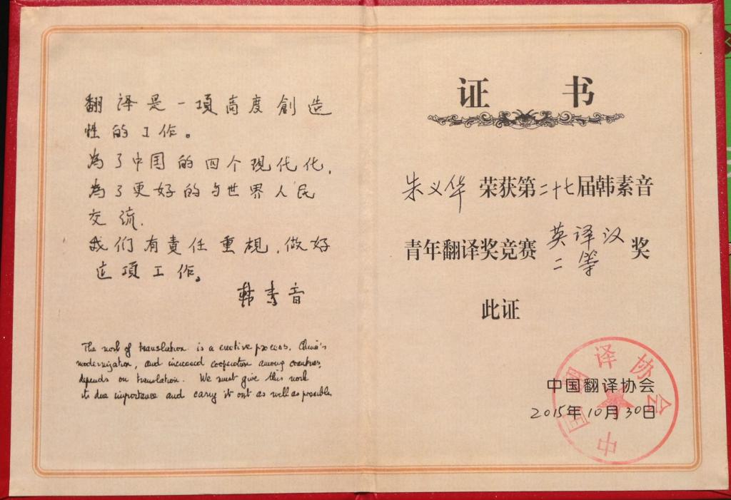 教师朱义华博士获本届大赛英译汉组二等奖与汉译英组三等奖,成为了本届参赛选手中唯一获此殊荣的参赛选手,这也是朱老师第八次获得该项赛事的大奖。