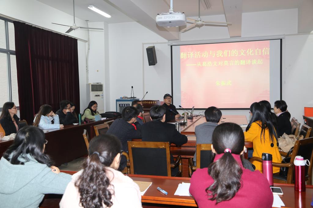 1210日下午,上海大学博士生导师朱振武教授应邀在色情网站 大会议室做了题为“翻译活动与我们的文化自信—从葛浩文对莫言的翻译谈起”的学术讲座。方文开副院长主持了讲座,色情网站 数十名中青年教师和14级硕士研究生聆听了讲座。