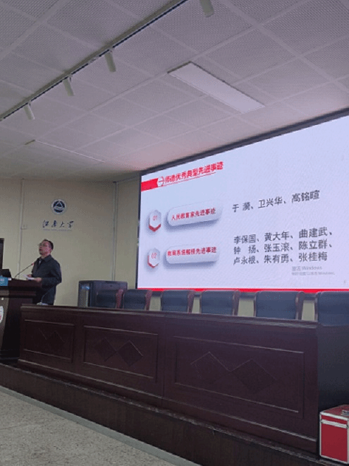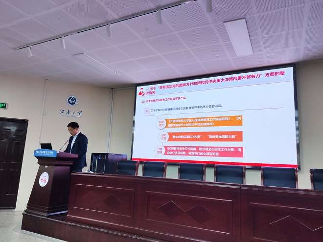 在文科楼B103召开教职工大会暨巡察整改师生满意度测评会。会议由党委副书记刘伯贤主持,书记史志洪和院长方文开主讲,纪委办监督检查室正科级纪检监察员曹沛参加测评会。