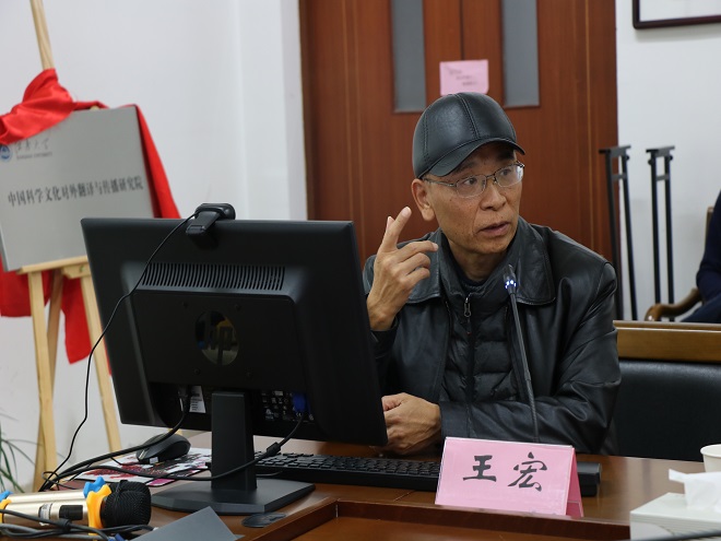 王宏教授在“中国古典科技翻译研究框架构建及相关对策”的讲座中指出,在当前国家大力弘扬中国文化“走出去”的大背景下,中国典籍翻译在作品翻译与出版、学术研究、人才培养等方面都取得了很大成就,但译界同仁对于中国古典科技类作品的翻译研究偏少,且相关研究呈碎片状。他结合我国科技典籍对外翻译传播史与当下研究现状,从理论研究、历史研究和应用研究三个层面勾勒中国古典科技翻译之研究框架,有助于推动中国古典科技文化知识与故事的对外传播,提升中华文化影响力。