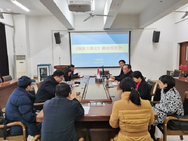 “译见中情”教师育人工作室全体成员在学院A349会议室举行《侗族大歌志》翻译推进会,翻译项目主要成员悉数到会。会议由“译见中情”教师育人工作室与《侗族大歌志》翻译项目负责人朱义华副院长主持,史志洪书记与方文开院长出席并讲话。