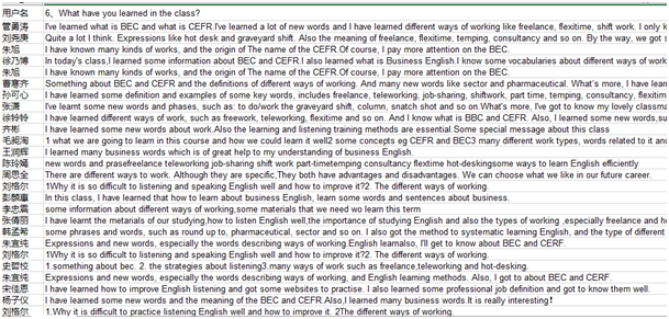 授课过程中,教师运用线上平台的签到功能,严格执行考勤制度。设计多样化的任务型教学活动,一方面,按计划实施教学过程,另一方面,灵活运用教学资源库,动态调整教学行为,听说结合,讲练结合,师生间积极互动,限时完成小任务,如抢答、互评、投票、小测验、多人实时在线编辑表单等,并实时反馈与评价。合理布置课后作业,监测学生学习进度,确保学生外语语言习得的成效,同时提升其自主学习能力。课后老师们收到众多学生的认可与点赞。