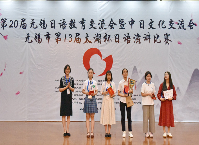 该比赛本次大会由无锡市人民政府外事办公室、无锡市教育局、无锡市翻译协会等联合主办,上海日本国总领事馆、无锡日商俱乐部等单位协办。上午的交流会上,日语系学生陈霄和李欣凝的二重唱“マーリーゴールド”荣获一等奖。下午的比赛中,经过激烈的角逐,我校学生凭借精彩的演讲,流利的日语打动了评委老师。穆澜同学荣获本科组特等奖,王文汇、倪心喆同学荣获本科组一等奖。中西由美子、田村恭平、藤田美奈子三位老师也荣获优秀指导教师奖。