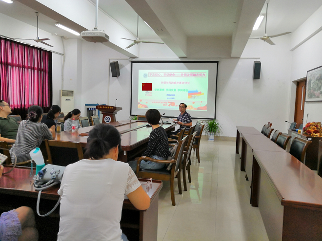 在文科楼A349举行了“不忘初心、牢记使命”主题教育之“外院发展路在何方暨外语学科发展战略研讨会”。学院全体教授、副教授,系部正副主任、支部正副书记,博士及青年教师代表分三场参加了教育活动与研讨会。