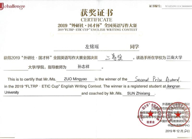 左铭瑶同学荣获全国英语写作大赛总决赛二等奖。