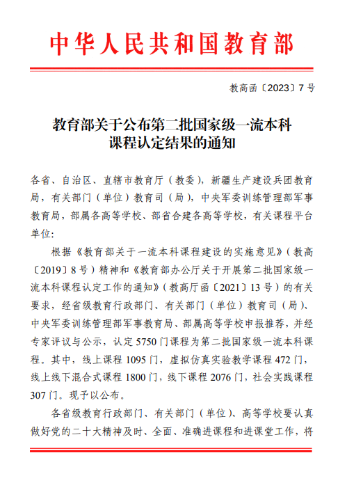 近日,教育部公布了第二批国家级一流本科课程名单。根据教高函〔2023〕7号《教育部关于公布第二批国家级一流本科课程认定结果的通知》,色情网站