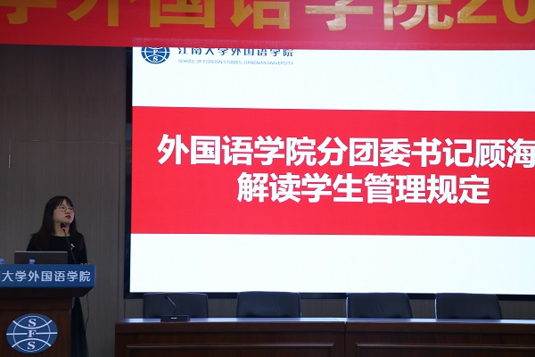 分团委书记顾海星围绕学籍管理、教学管理、学院管理、评奖评优、勤工助学、违纪处罚等六大板块,详细解读了学生相关管理规定,强调严格考纪、成绩预警等方面的注意事项,帮助新生明晰学校与学院管理规章制度,为养成良好的学习与生活习惯打下基础。