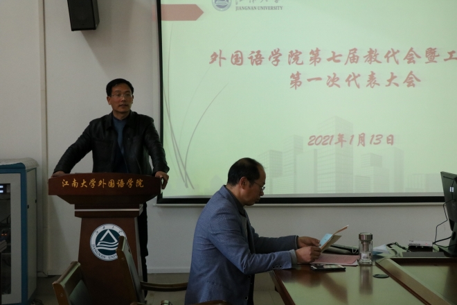 会议在庄严的国歌声中拉开帷幕。首先,由方文开院长代表学院行政做工作报告。方院长从人才与队伍建设、本科生培养与质量工程、研究生培养与学科建设、科学研究与社会服务等四个方面总结了学院过去三年中取得的成就和获得的荣誉,并总结了工作创新点、特色和主要经验,同时也针对学位点建设、团队建设和语种发展的空间等问题摆出了问题与不足。报告数据详实分析透彻,受到了与会代表的认可。