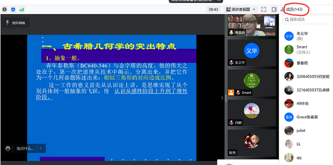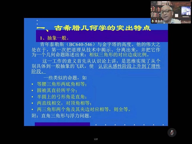 董教授首先从词源学角度引入“几何”一词的意义,并指出,在实践需要的推动下,大河文明时期的人们积累了一定的几何学知识,但古埃及、巴比伦及中国的知识都偏于具体、是用计算,是零散方法的汇集,而古希腊人却独树一帜,达到了古代科学的最高峰。