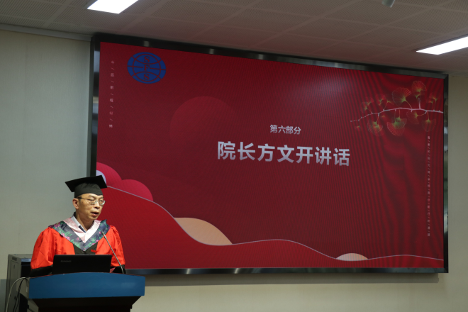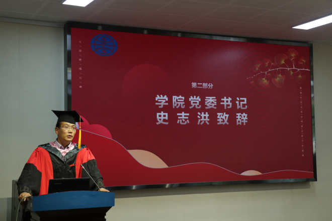 典礼伊始,学院党委书记史志洪致辞。史志洪首先代表学院党委向全体毕业生表示热烈的祝贺和美好的祝福,向老师与家长致以崇高的敬意和衷心的感谢,并对同学们提出了三点希望:一是胸怀大局,不断增加人生的高度。二是求真务实,不断增加人生的宽度;三是追求卓越,不断增加人生的厚度。最后祝愿所有毕业生们扬帆起航,开启美好新征程。
