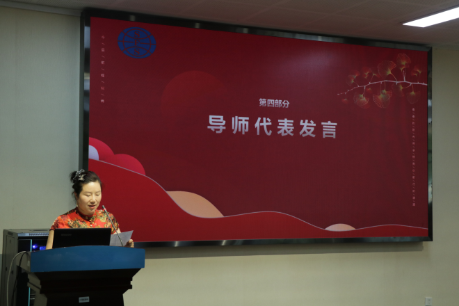 导师代表张俊萍表达了对同学们的美好祝福和殷切期望。张老师表达了三个愿景:一愿毕业生们一往无前地放眼世界,拥抱世界;二愿毕业生们勇敢地扛起家庭责任,扛起幸福担当;三愿毕业生们在艰难的拼搏中原谅生活,热爱生活。最后送给同学们路易斯·格丽克End of Winter中的一句诗作为结语,希望同学们不忘初心,逐梦远航。