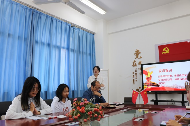 交流讨论环节,党员们结合学习内容展开热烈讨论,积极发言,交流学习感悟。同学们表示,通过学习更加意识到了不断学习新思想新理论的重要性,有了新思想才能引领新实践。作为外语专业的党员,从时政与专业相结合的角度出发,应该加强学习双语时政热点的正确表述,这样才能更好的传播红色文化,树立正确的大国形象。