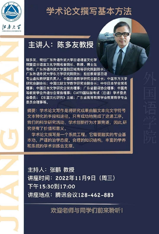 11月9日下午,教育部外国语言文学教学指导委员会日语分委员会委员、广东外语外贸大学东方研究院院长陈多友教授应邀为色情网站 师生做了题为“学术论文撰写基本方法”的线上专题讲座。讲座由日语系主任张鹏教授主持。