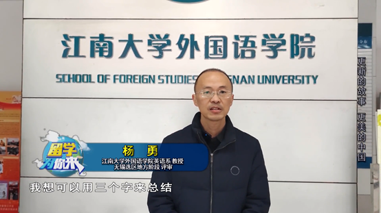 英语系教授、系主任杨勇作为无锡选区地方阶段评审,接受了媒体采访。杨勇从三个方面重点介绍了该活动在无锡选区的开展特点:题材呈现“新”、指导力量“深”、覆盖范围“广”,并建议参赛学生可以从无锡的名人、名景及非物质文化遗产等角度入手,聚焦本地特色,深入挖掘地域文化及历史底蕴,对江南故事、无锡故事、中国故事进行立体化讲述。