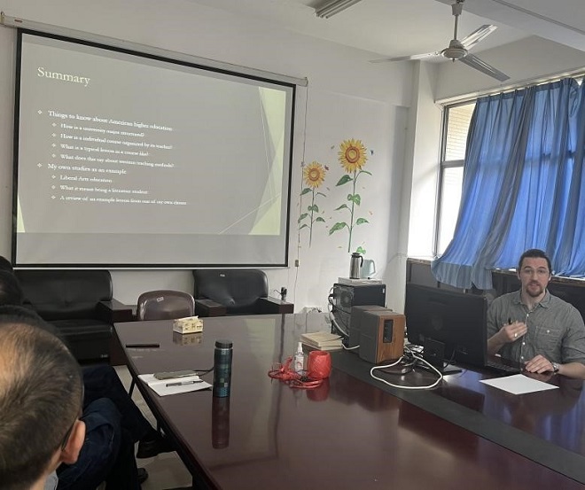 “英语系教研共同体”系列讲座第五场,在文科楼B307成功举办。该讲座是系列讲座中首场由外籍教师主讲,中外教师围绕“新文科”背景下“课程设置”、“专业培养”、“案例研究”等展开热烈探讨。