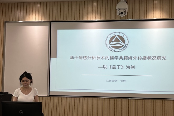 在翻译方向分论坛中,黄婷同学以“基于情感分析技术的儒学典籍海外传播状况研究”为题进行分享,包括研究背景及意义、研究现状、研究设计和研究结果等方面的内容。研究从儒学典籍《孔子》的英译本在网络上收获的评价出发,结合情感分析,借助语义网络和情感极性对《孔子》书评中的高频关键词和读者情感倾向进行分析和统计,并比较了翻译问题、哲学思想和文本内容的情感分布条数。王金安、朱义华老师指出,该论文的切入点合适,条理清晰,技术分析手段新颖。点评专家也提醒在座的研究生要注重培养思辨性,挖掘有意义、有价值的研究。