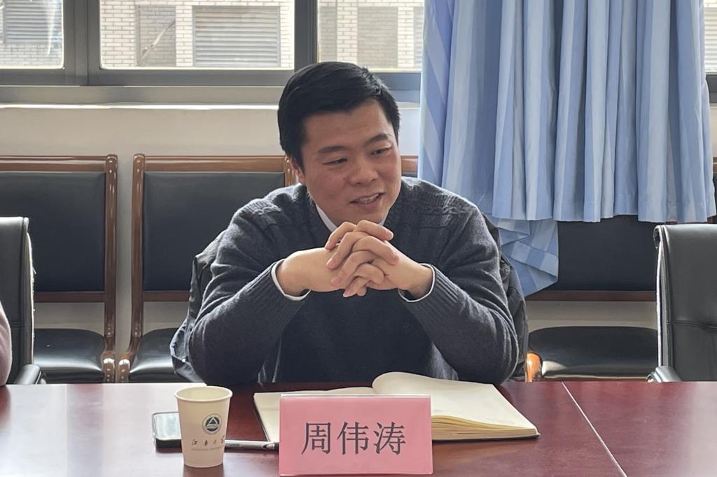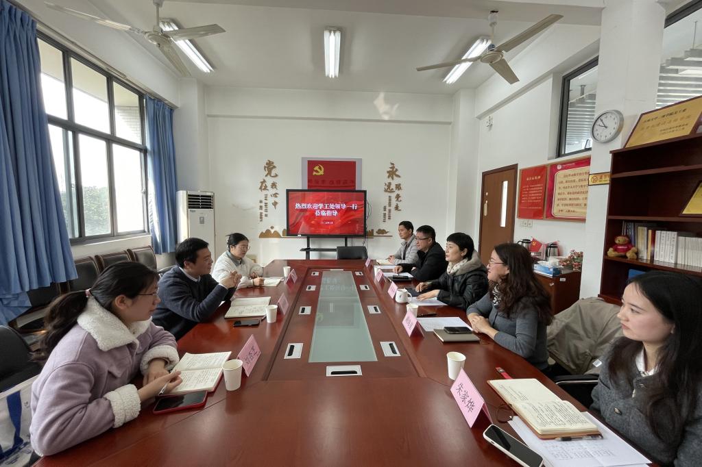 李荣华代表学院对学生工作处一行的到来表示热烈欢迎,向学生工作处一直以来对学院的关心和支持表示衷心感谢。季王飞详细介绍了学院学生工作体系。他指出,学院通过思想引领、学风建设、社会实践、心理健康、资助育人等多轮驱动,构建了分工明确、机制完善的育人格局。