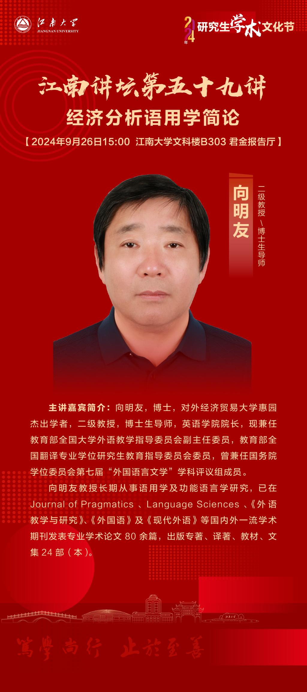 向明友,博士,对外经济贸易大学惠园杰出学者,二级教授,博士生导师,英语学院院长,现兼任教育部全国大学外语教学指导委员会副主任委员,教育部全国翻译专业学位研究生教育指导委员会委员,曾兼任国务院学位委员会第七届“外国语言文学”学科评议组成员。向明友教授长期从事语用学及功能语言学研究,已在Journal of Pragmatics 、Language Sciences 、《外语教学与研究》、《外国语》及《现代外语》等国内外一流学术期刊发表专业学术论文 80 余篇,出版专著、译著、教材、文集 24 部(本)。