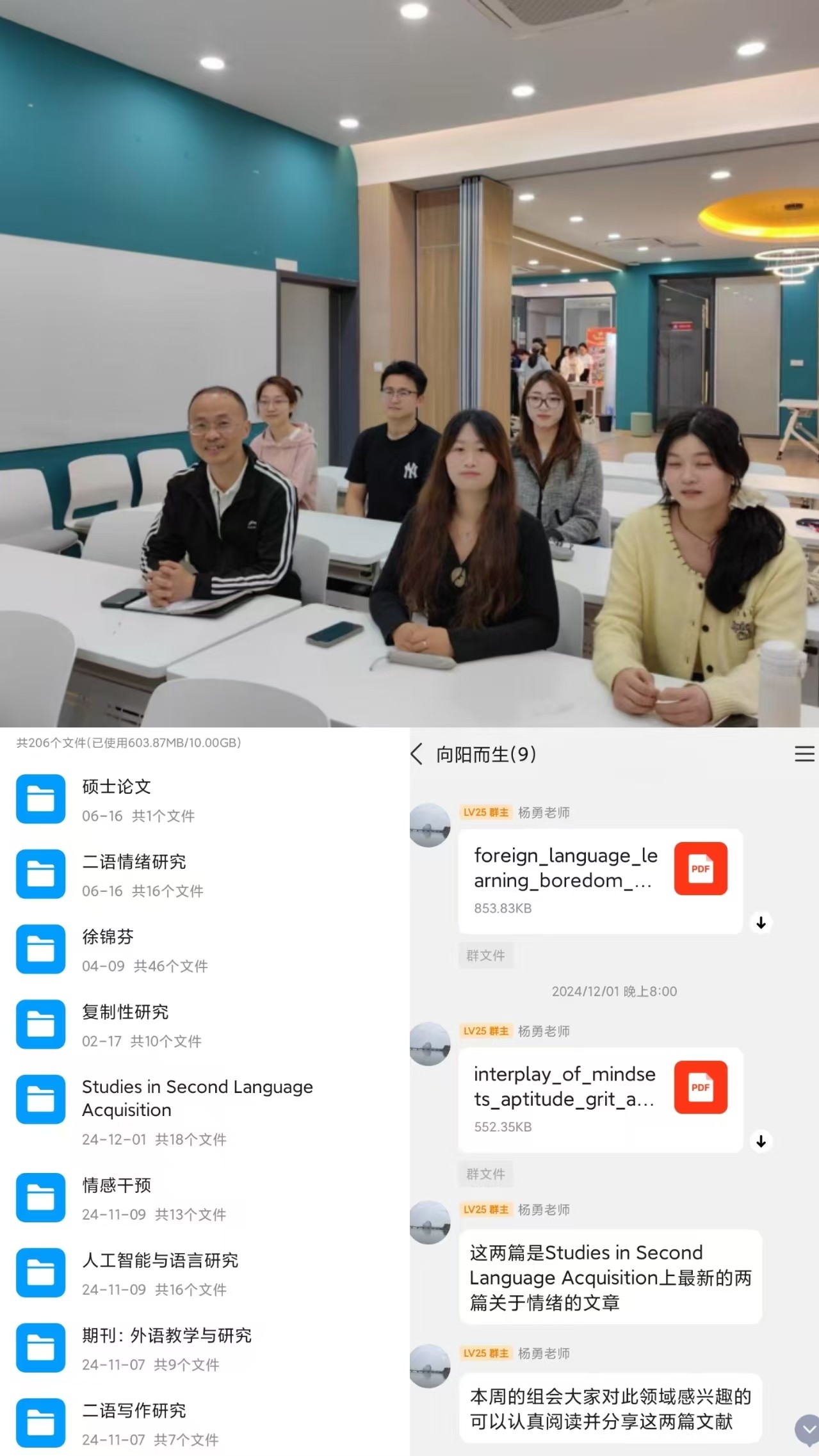 杨老师是我学术征途的引路人。大三时的学术写作课让我初识这位学者。他以严谨的治学精神和对二语习得的精彩阐释,点燃了我对研究的热情。在杨老师的鼓励与指导下,我完成了学术生涯的头两篇论文。从逐句推敲的修改到期刊选择的细致建议,杨老师事必躬亲,其耐心与细腻深深触动了我,使我毫不犹豫地选择杨老师作为研究生导师。这一选择从未让我失望。杨老师如春风般温暖,学业上,他逐字批改论文,引领我们潜心钻研;生活中,他关怀备至,无论是琐碎小事还是人生规划,他总以亲切的微笑为我们排忧解难,事无巨细,皆用心对待,是我们最坚实的依靠和最大的底气。他的乐观与热忱,潜移默化地感染着我们,让我们在学术与生活中皆充满力量,蓬勃向上。