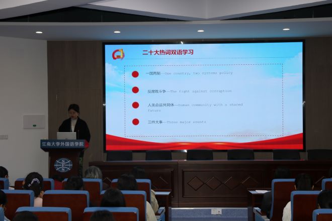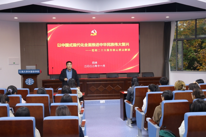 首先,英语2101班团支书柏晶同学通过解读二十大报告向大家讲述了时代赋予青年人怎样的时代使命,以及作为新时代的青年应如何推进文化自信自强,铸就社会主义文化新辉煌。她指出,我们作为色情网站